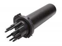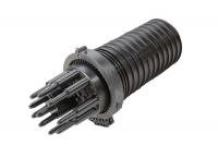 Способ герметизации вводов кабелей, осуществляется с помощью термоусаживаемых трубок ТУТ. Круглые патрубки на оголовнике муфты изначально герметичны и имеют ступенчатую форму с разными диаметрами. Срезая патрубок в определенном месте можно подобрать отверстие максимально близкое к диаметру вводимого кабеля. Таким образом, исключается излишнее натяжение ТУТ после усадки при вводе относительно тонких кабелей. Все патрубки муфты оснащены также индивидуальными узлами крепления ЦСЭ.
