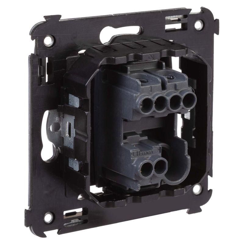 Выключатель одноклавишный однополюсный, модульный. Предназначен для монтажа в системы "In-liner Front" и "In-liner Aero" при помощи рамок-суппортов и каркасов "Avanti" (код 4400912 и т.д.); включения/выключения освещения. Характеристики: диаметр отверстий для ввода кабелей – 3 мм (по 2 отверстия на одну клемму); винтовые зажимы; шаблон для зачистки кабеля – 11 мм; номинальный ток – 16 A; номинальное напряжение – 230 В; возможна фиксация в подрозеточные коробки при помощи каркаса с лапками (код 4400802) и саморезов. 2 модуля. Цвет: "Черный квадрат".