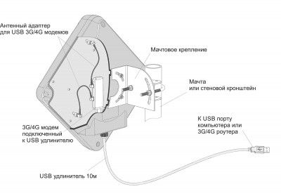 Вход антенны имеет короткое замыкание по постоянному току между внешним и внутренним проводниками.Связь антенны с модемом осуществляется посредством адаптеров SMA-female/CRC9или другими (выбирается при покупке). Для выноса антенны используется USB-удлинитель длиной 10метров, благодаря чему значительно сокращены потери сигнала в высокочастотном кабеле между антенной и модемом.
