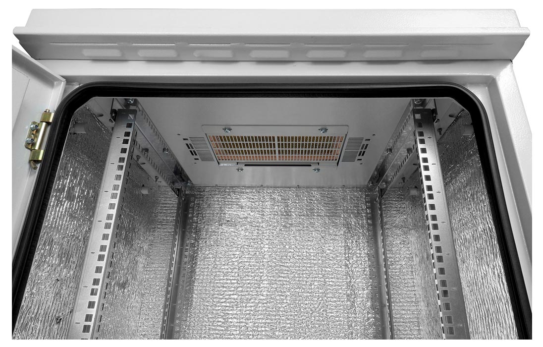 Дверь шкафа двухслойная вентилируемая, внутри установлен фильтр, также имеются места для установки вентиляторного модуля.