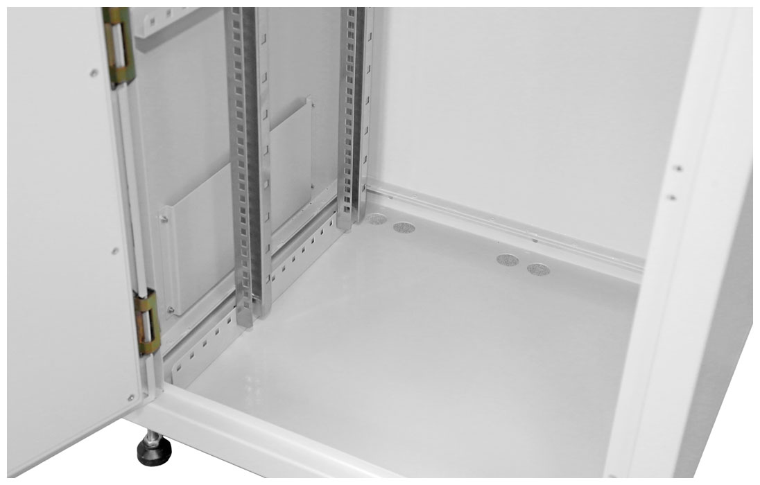 Шкаф комплектуется двумя парами вертикальных (юнитовых) направляющих, регулируемых по глубине. Для вентиляции оборудования предусмотрена перфорация в боковых стенках шкафа. Отверстия изнутри защищены металлическими перфорированными панелями. В основании шкафа предусмотрены защищенные кабельные вводы и система заземления.