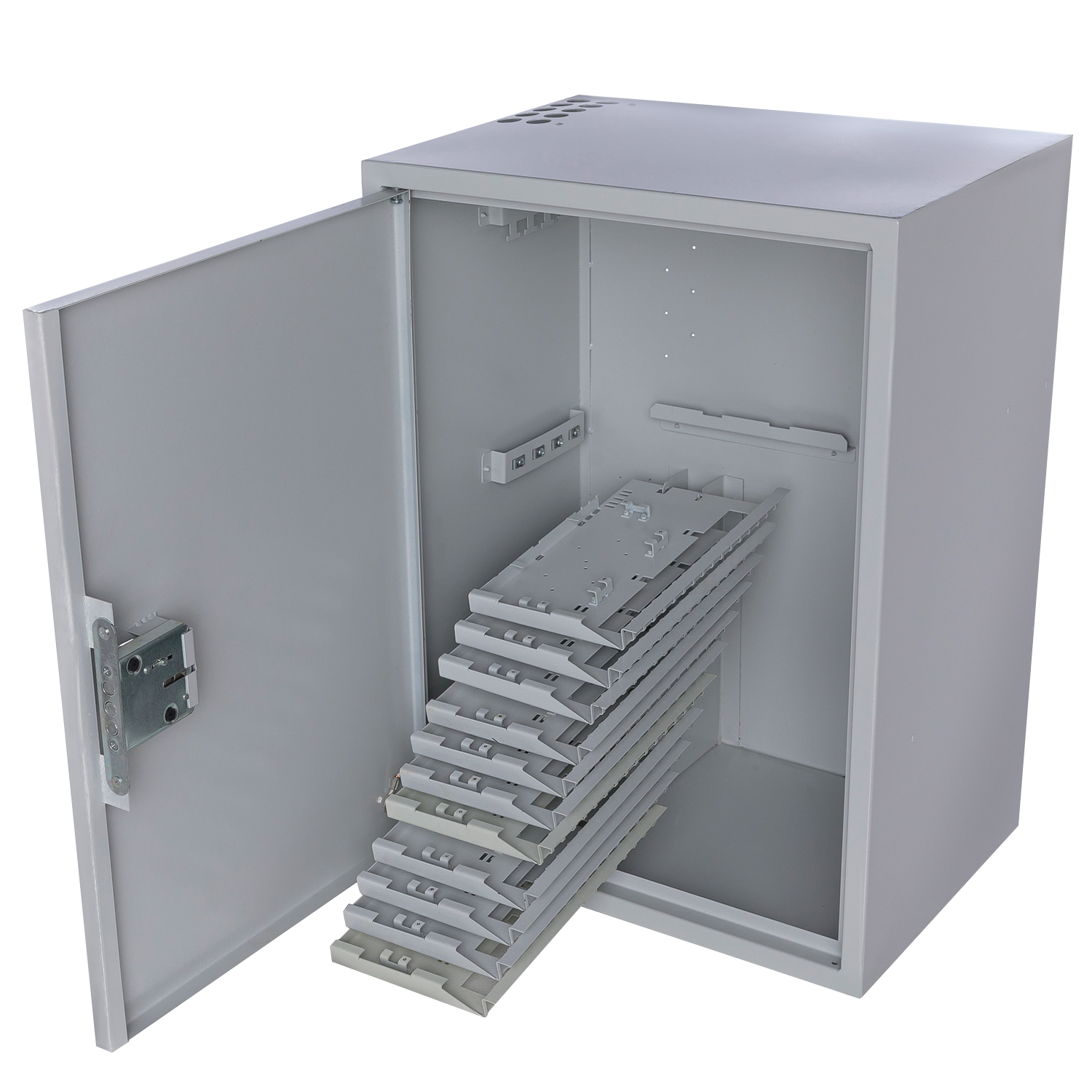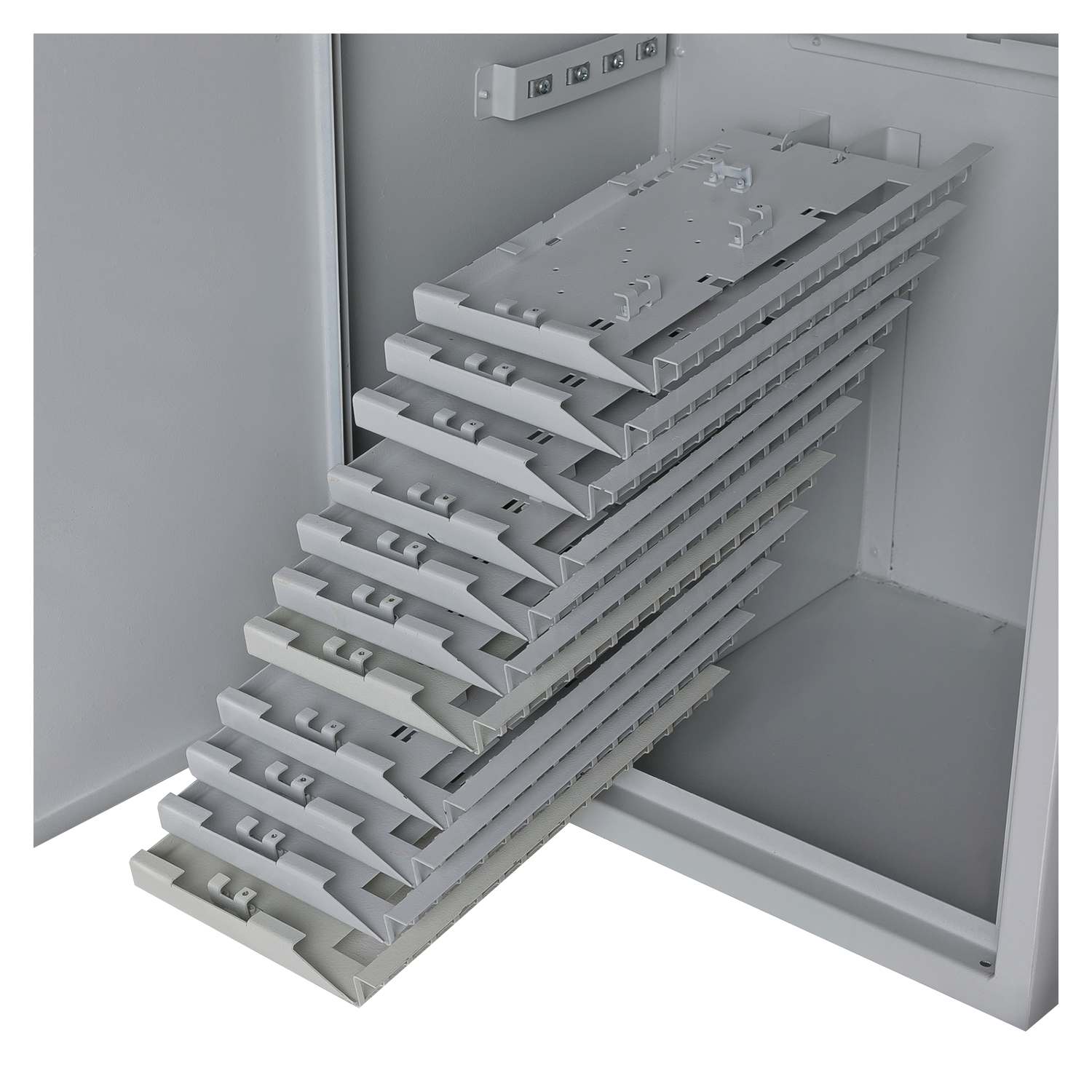 Складные кросс-модули, встроенные в блок, позволяют существенно уменьшить глубину шкафа при увеличении количества портов. Оптические кабели вставляются в шкаф через отверстия в верхней и нижней стенках, которые оснащены пылезащитными чехлами. В закрытом положении поперечные модули запираются один за другим. Каждый отдельный модуль можно снимать и проводить работы вне шкафа.