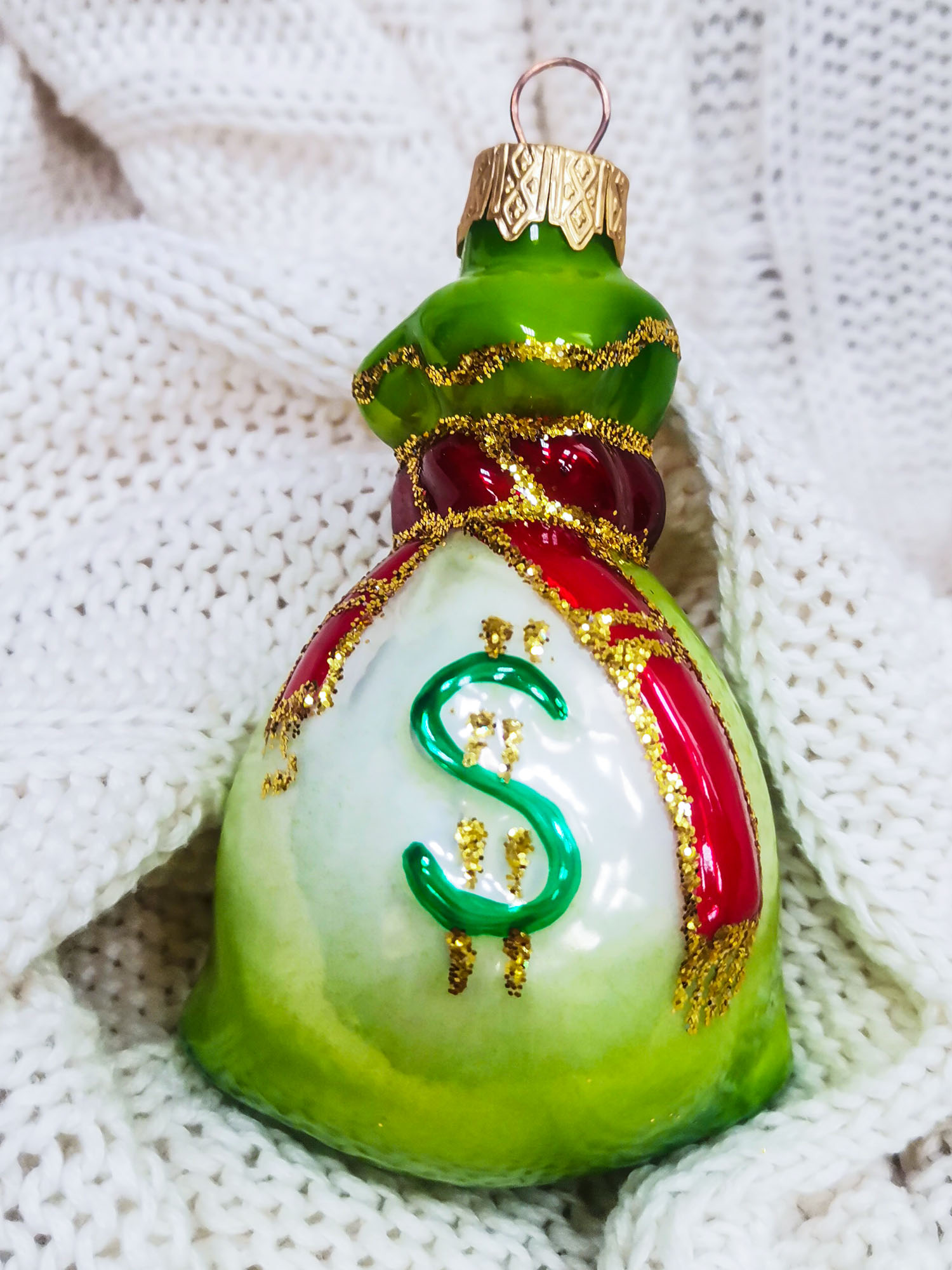 Елочная новогодняя игрушка КОЛОМЕЕВ, Денежный мешок, высота 10 см.