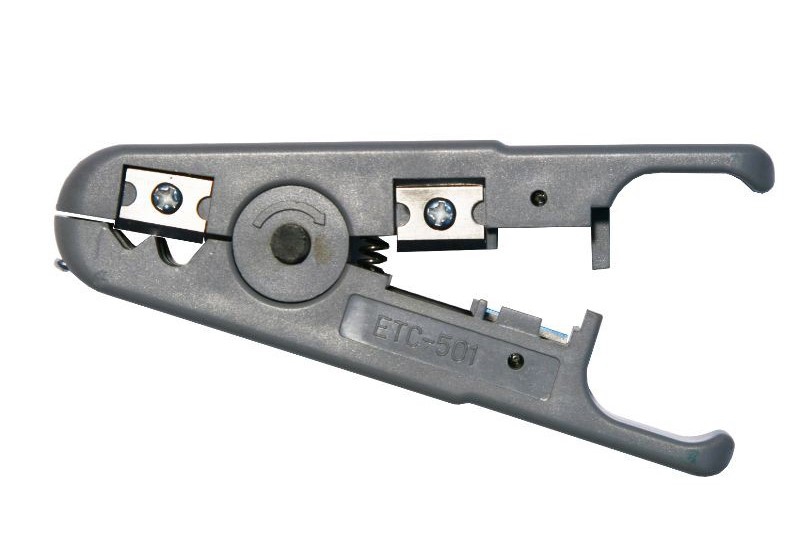 С помощью данного инструмента можно эффективно и быстро обрезать концы витой пары и произвести зачистку. Инструмент снабжается сменными ножами, с помощью которых можно снимать внешнюю оболочку с проводников. Имеется возможность регулировать глубину надреза, благодаря чему работа будет выполнена аккуратно и точно. С помощью регулировочного колеса можно изменить глубину прорезания внешней изоляции и благодаря этому удается избежать повреждения жил кабеля.