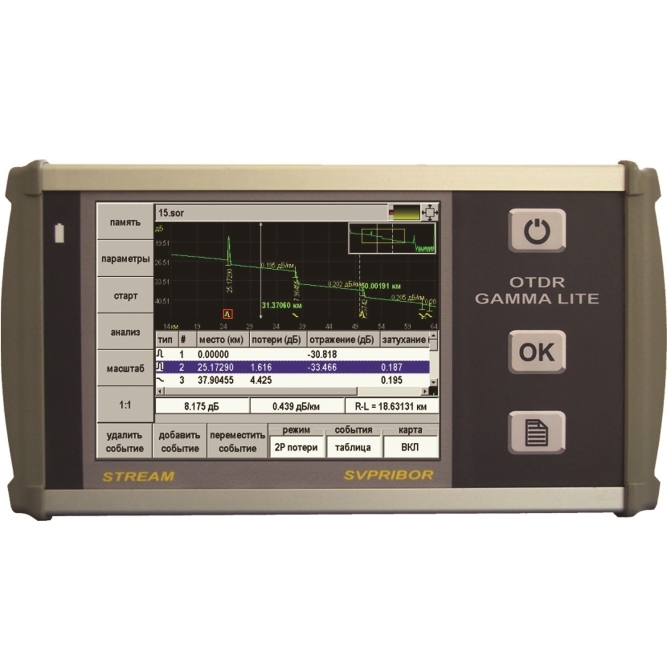 - «Автоматические измерения»: просто нажать кнопку «старт»-прибор сам выставит нужные параметры, проведет измерения и покажет рефлектограмму с анализом технического состояния линии.