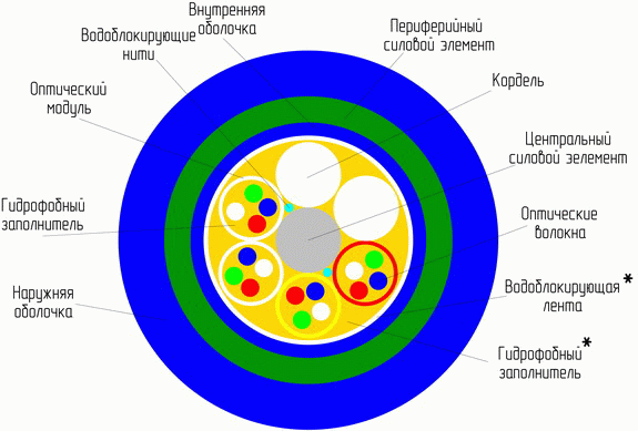 * Междумодульное пространство заполнено гидрофобным заполнителем или поверх скрученных оптических модулей и корделей наложена водоблокирующая лента.