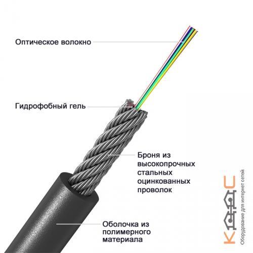 В конструкции кабеля используется гибкая броня из 6 стальных оцинкованных канатных проволок прочностью 1770 Н/мм2. Диаметр брони – всего 1,6 - 2 мм, при этом соотношение масса/прочность кабеля выше, чем у любого другого оптического кабеля. Канатные проволоки не только позволяют кабелю гнуться при прокладке, но и принимают прямолинейную форму при снятии нагрузки (пружинят). Стандартная толщина оболочки 0,5 мм. При заказах кабеля этой марки партиями более 20 км возможно предоставление специальных цен.