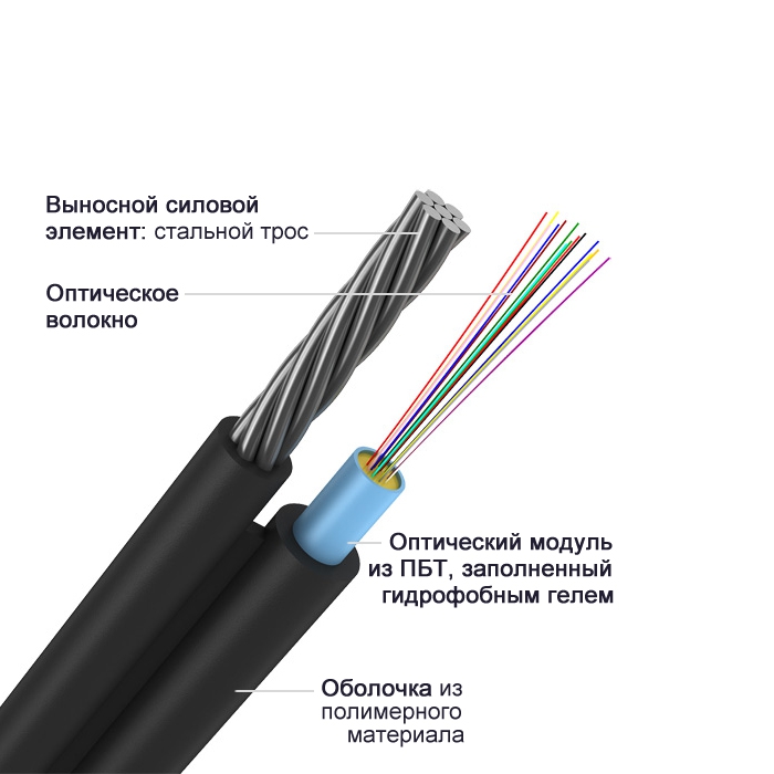 Кабели содержат центральный оптический модуль (ЦОМ), поверх ЦОМ наложена наружная оболочка из полиэтилена в виде восьмерки.