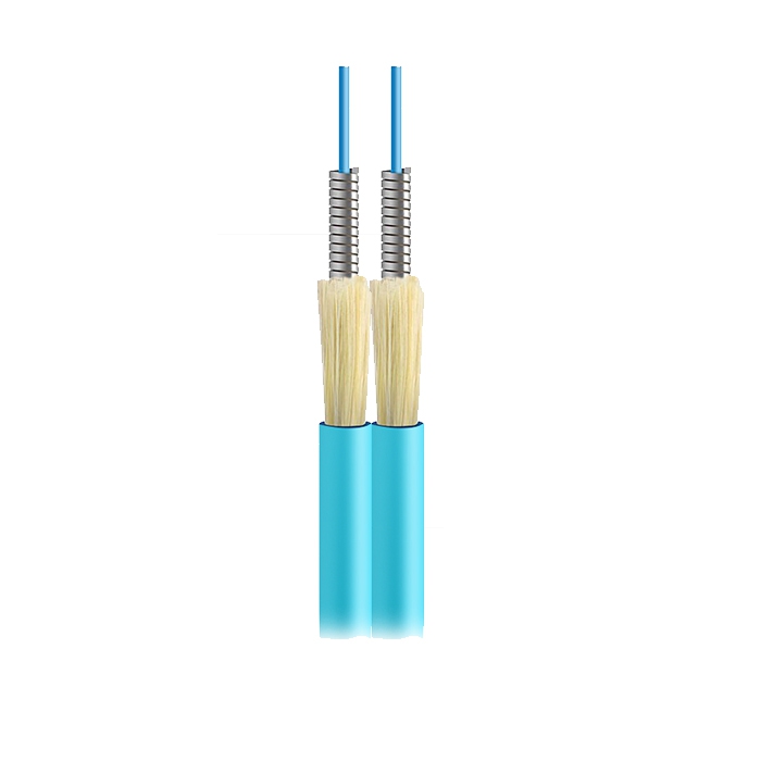 Гибкий волоконно-оптический кабель с плотным буфером (tight buffer), бронированный. Броней служит стальная спиральная лента. Содержит два оптических волокна в буферном покрытии внешним диаметром 0,6 мм, защищенных броней, усиленных упрочняющими арамидными нитями и объединенных в дуплексную конструкцию (типа zip). Конструкция защищена внешней оболочкой из огнестойкого малодымного безгалогенного компаунда (LSZH).