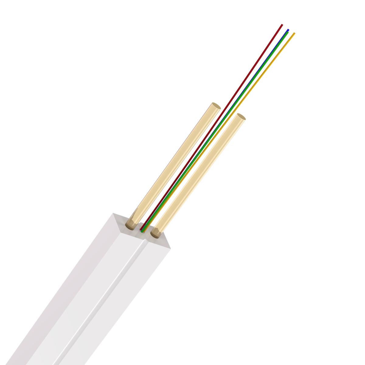 Плоский гибкий малогабаритный кабель. Применяется в сетях по технологии оптика до клиента. Обеспечивает низкие потери на изгибах малого радиуса. Предназначен для подключения индивидуальных абонентов в офисах и многоквартирных жилых домах. Используется в сетях кабельного телевидения в качестве абонентского (отводного) кабеля, а также в локальных сетях для прокладки до рабочего места. От 1 до 4 оптических волокон (ОВ), соответствующие одной из рекомендаций МСЭ-Т G.651, G.652, G.653, G.655, G.657, находятся в центре конструкции кабеля. Силовой элемент - два стеклопластиковых прутка, расположены в одной плоскости, параллельно ОВ. Внешняя оболочка выполнена из негорючего полимерного материала.