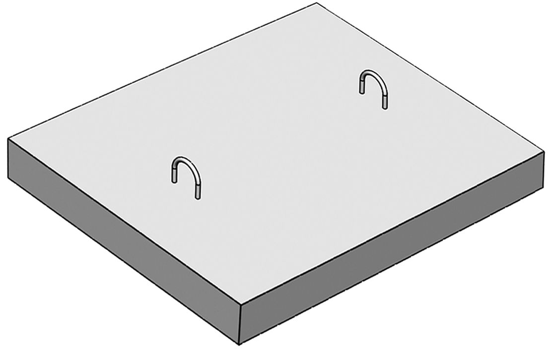 Плита имеет прямоугольную форму. На верхней поверхности плиты расположены две строповочных петли. После установки пластикового колодца на плиту, производят их крепление с помощью анкерных болтов.