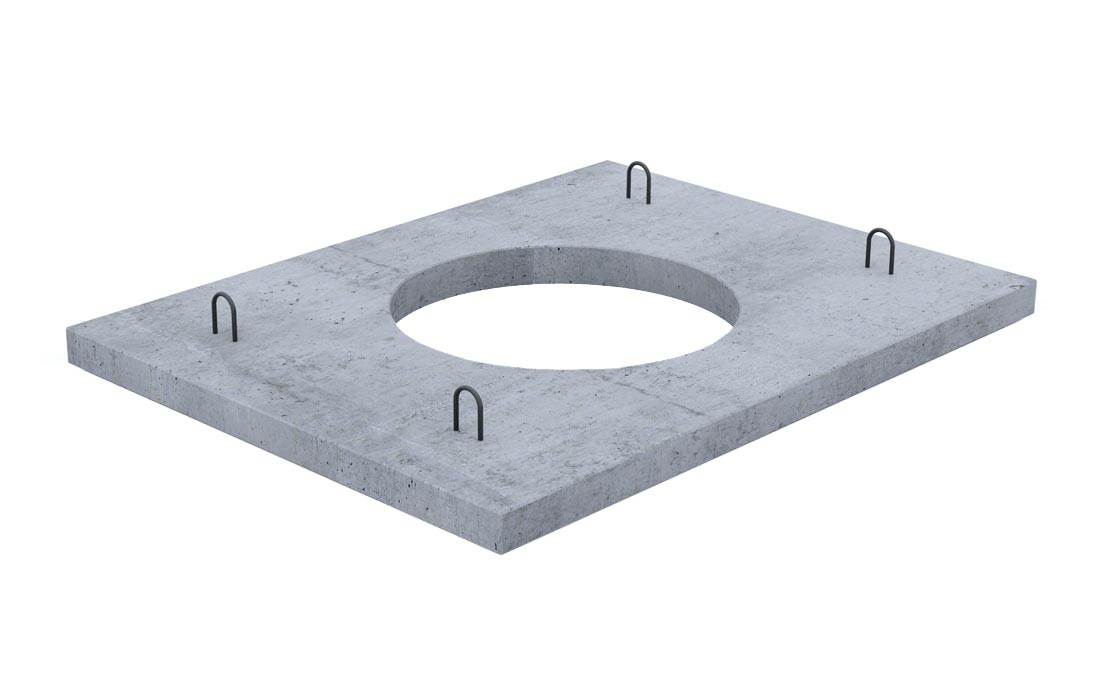 Плита имеет прямоугольную форму, в центре которой расположено круглое отверстие диаметром 600 мм, для формирования горловины с люком. На верхней поверхности плиты, с четырех сторон располагаются петли для строповки.