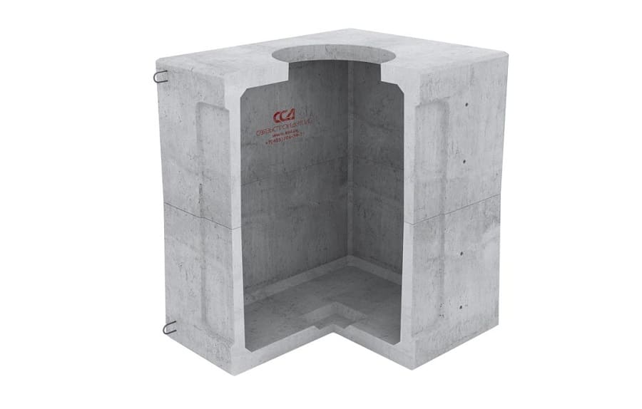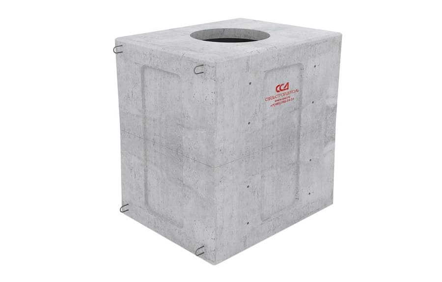 Колодец имеет в сечении прямоугольную форму и состоит из двух элементов – верхней и нижней половин. Перекрытие верхнего элемента дополнительно армировано и содержит круглое отверстие диаметром 600 мм для формирования горловины с люком. В основании нижней половины колодца с внутренней стороны расположена прямоугольная ниша. При необходимости, ее стенку вырезают для создания дренажа. На наружных поверхностях торцевых и боковых стен расположены ниши, в пределах которых можно проделывать отверстия для ввода каналов. В виду того, что стенки в нишах не имеют отверстий, это позволяет в местах строительства кабельных колодцев проделывать (высверливать) отверстия в тех местах, в которых к колодцу подходят трубы.