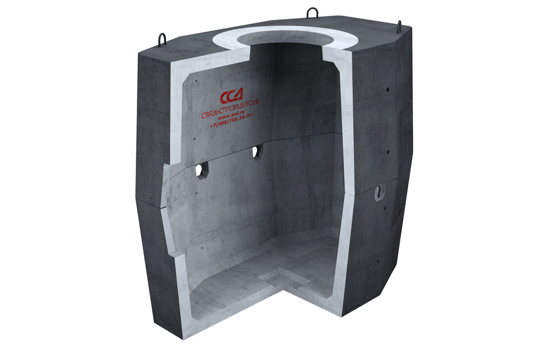 Колодец имеет в сечении восьмиугольную форму и состоит из двух элементов – верхней и нижней половин. На элементах колодца имеются петли для строповки при погрузке и разгрузке их с автомобиля, а также для опускания в котлован. Перекрытие верхнего элемента дополнительно армировано и содержит круглое отверстие диаметром 600 мм для формирования горловины с люком. В основании нижней половины колодца с внутренней стороны расположена прямоугольная ниша. При необходимости, ее стенку вырезают для создания дренажа. На внутренних поверхностях торцевых стенок элементов колодца также имеются армированные ниши. В центре ниш расположены технологические отверстия для ввода двух труб с внутренним диаметром 100 мм. Для ввода и вывода каналов на наружных поверхностях боковых стенок колодца расположены по две ниши, с каждой из сторон. Так как стенки ниш армированы, то для ввода труб в колодец необходимо вырезать отверстия углошлифовальной машиной (болгаркой) или высверливать с помощью коронок.
