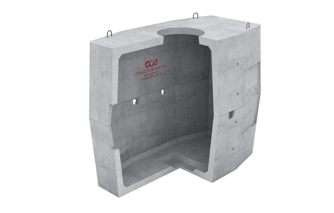 Колодец имеет в сечении восьмиугольную форму и состоит из двух элементов – верхней и нижней половин. На элементах колодца имеются петли для строповки при погрузке и разгрузке их с автомобиля, а также для опускания в котлован. Перекрытие верхнего элемента дополнительно армировано и содержит круглое отверстие диаметром 600 мм для формирования горловины с люком. В основании нижней половины колодца с внутренней стороны расположена прямоугольная ниша. При необходимости, ее стенку вырезают для создания дренажа. На внутренних поверхностях торцевых стенок элементов колодца также имеются армированные ниши. В центре ниш расположены технологические отверстия для ввода двух труб с внутренним диаметром 100 мм. Для ввода и вывода каналов на наружных поверхностях боковых стенок колодца расположены по две ниши, с каждой из сторон. Так как стенки ниш армированы, то для ввода труб в колодец необходимо вырезать отверстия углошлифовальной машиной (болгаркой) или высверливать с помощью коронок.