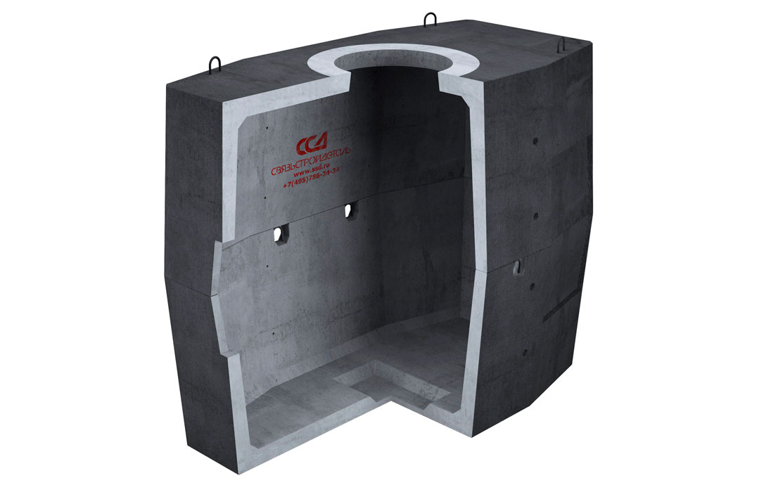 Колодец имеет в сечении восьмиугольную форму и состоит из двух элементов – верхней и нижней половин. На элементах колодца имеются петли для строповки при погрузке и разгрузке их с автомобиля, а также для опускания в котлован. Перекрытие верхнего элемента дополнительно армировано и содержит круглое отверстие диаметром 600 мм для формирования горловины с люком. В основании нижней половины колодца с внутренней стороны расположена прямоугольная ниша. При необходимости, ее стенку вырезают для создания дренажа. На внутренних поверхностях торцевых стенок элементов колодца также имеются армированные ниши. В центре ниш расположены технологические отверстия для ввода двух труб с внутренним диаметром 100 мм. Для ввода и вывода каналов на наружных поверхностях боковых стенок колодца расположены по две ниши, с каждой из сторон. Так как стенки ниш армированы, то для ввода труб в колодец необходимо вырезать отверстия углошлифовальной машиной (болгаркой) или высверливать с помощью коронок.