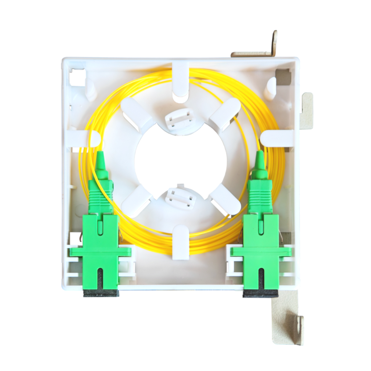 Абонентская розетка оптическая устанавливается непосредственно в помещениях конечных пользователей (абонентов), несет функцию оконечивания оптического волокна любого типа (G.652, G.657) и размещения запаса волокна в сетях FTTH. Оптическая настенная розетка имеет компактные размеры (86 x 86 мм) и выполнена из пластика не поддерживающего горения (материал не выделяющий галогенов).