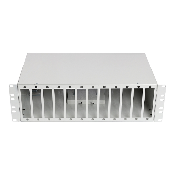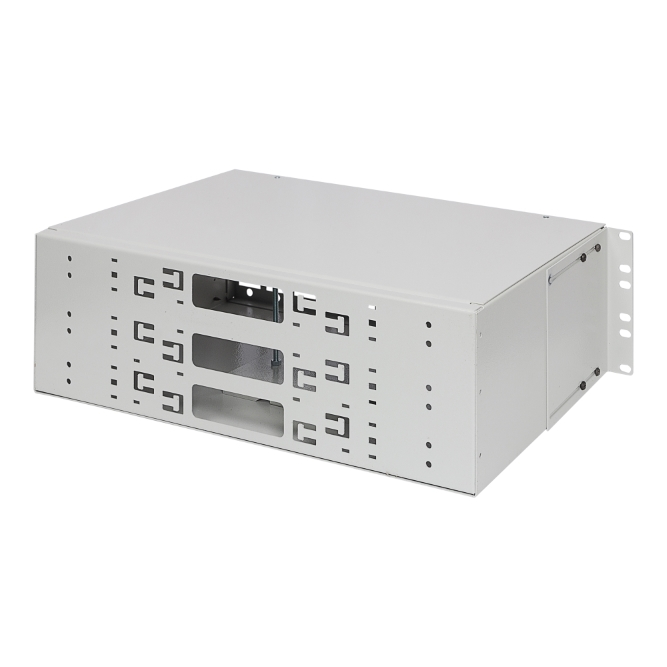 Оптический кросс представляет из себя металлическую коробку с лицевой стороны которой расположены отверстия под сменные планки для оптических проходных адаптеров (розетки) различного типа. На передней стенке 9 отверстий под планки различных типов проходных розеток. Для удобства монтажа планки можно чередовать, например, установить планку с разъемами SC, планку с разъемами FC и т.д и планку пустую(заглушку).