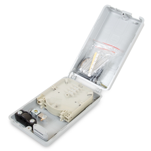 Пластиковая настенная оптическая кросс-муфта GP-D мини позволяет разделывать до 24 оптических волокон. Пигтейлы выводятся наружу через специальные уплотнители.