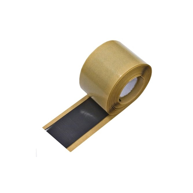 Лента герметизирующая на полиэтиленовой основе с клеевым слоем постоянной липкости, черного цвета, дублирована одним слоем силикононизированной бумаги.