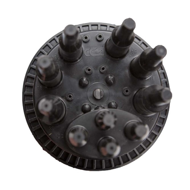 Способ герметизации вводов кабелей, осуществляется с помощью термоусаживаемых трубок ТУТ. Круглые патрубки на оголовнике муфты изначально герметичны и имеют ступенчатую форму с разными диаметрами. Срезая патрубок в определенном месте можно подобрать отверстие максимально близкое к диаметру вводимого кабеля. Все патрубки муфты оснащены также индивидуальными узлами крепления ЦСЭ.