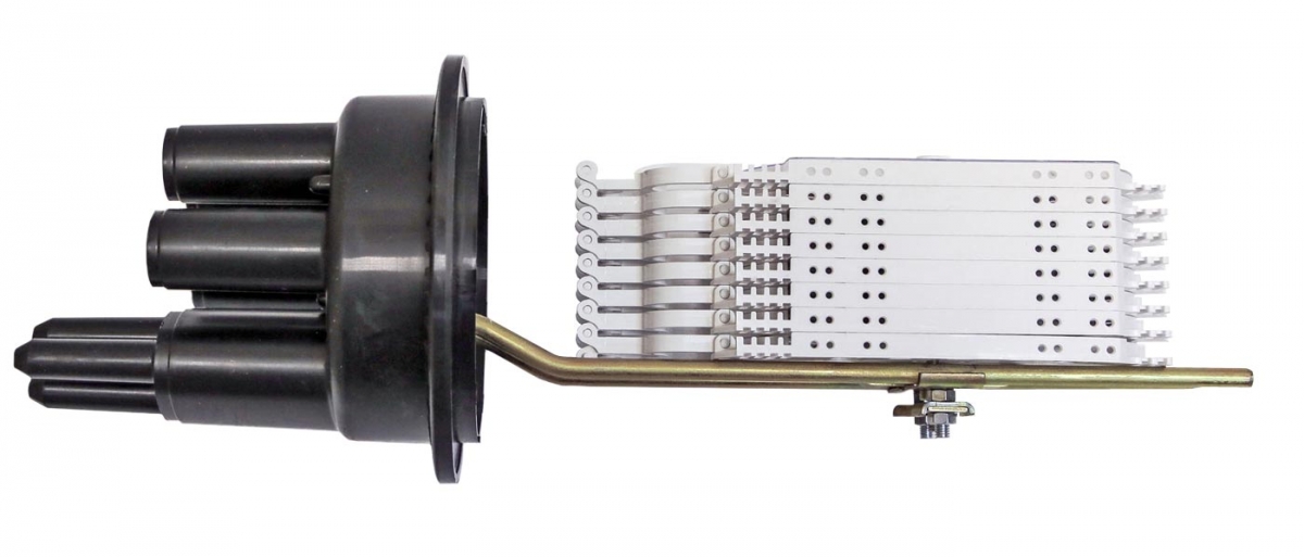 В муфте предусмотрен овальный ввод для транзитной петли оптических модулей без разрезания. Выкладка петли модулей осуществляется на лотке с противоположной стороны от кассет.