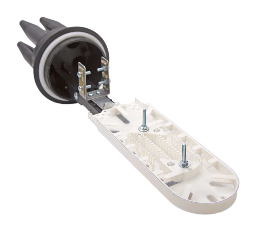 Способ герметизации вводов кабелей, осуществляется с помощью термоусаживаемых трубок ТУТ. Круглые патрубки на оголовнике муфты изначально герметичны и имеют ступенчатую форму с разными диаметрами. Срезая патрубок в определенном месте можно подобрать отверстие максимально близкое к диаметру вводимого кабеля. Таким образом, исключается излишнее натяжение ТУТ после усадки при вводе относительно тонких кабелей. Все патрубки муфты оснащены также индивидуальными узлами крепления ЦСЭ.