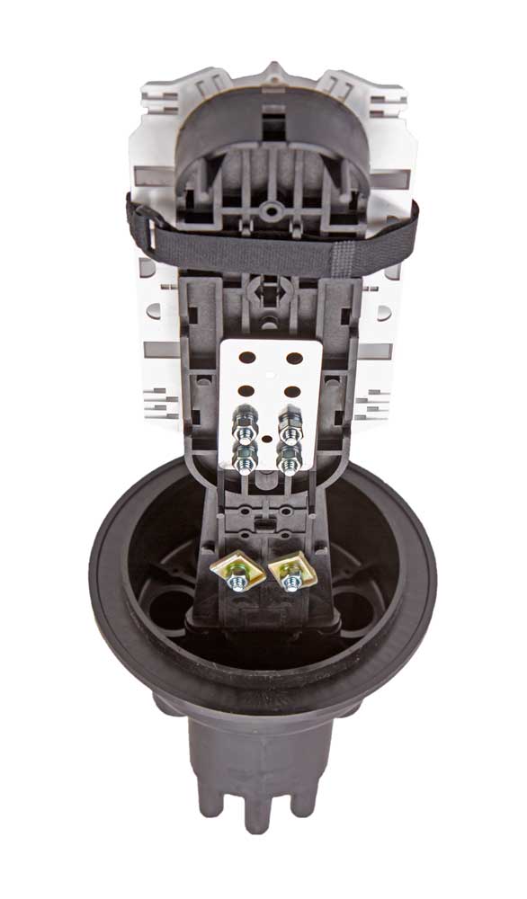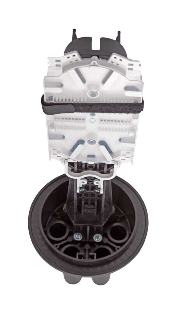 В муфте предусмотрен овальный ввод для транзитной петли оптических модулей без разрезания. Выкладка петли модулей осуществляется на лотке с противоположной стороны от кассет.