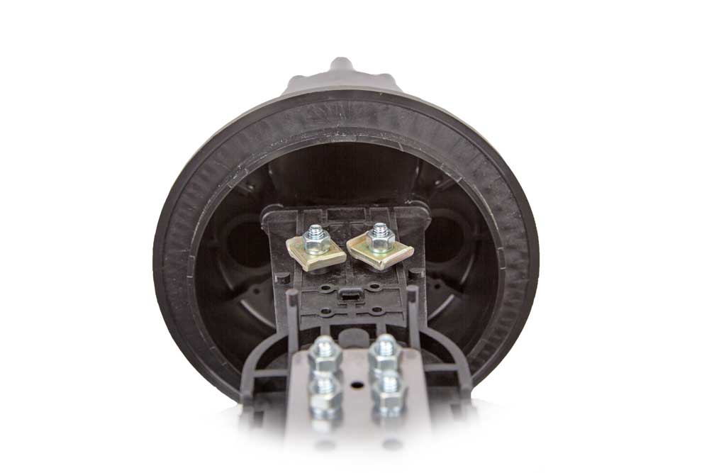 Овальный патрубок муфты может использоваться для одного из перечисленных случаев: 1) ввода 4-х тонких кабелей до 10 мм или 2) ввода транзитной петли кабеля или 3) ввода двух кабелей диаметром до 25 мм. Во втором и третьем случаях для герметизации необходимо дополнительно приобрести (Ввод №6).