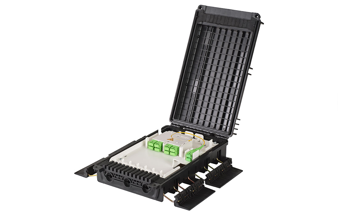 Выполнена из пластмассы и имеет пыле-брызгозащищенную тупиковую конструкцию (ввод ОК и вывод абонентских дроп-кабелей производится с одной стороны).