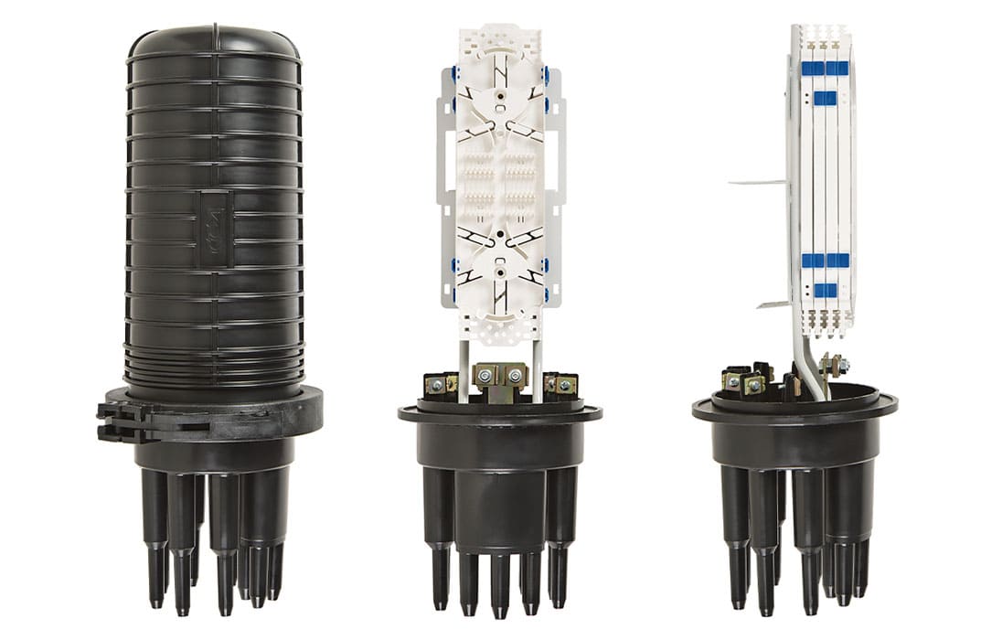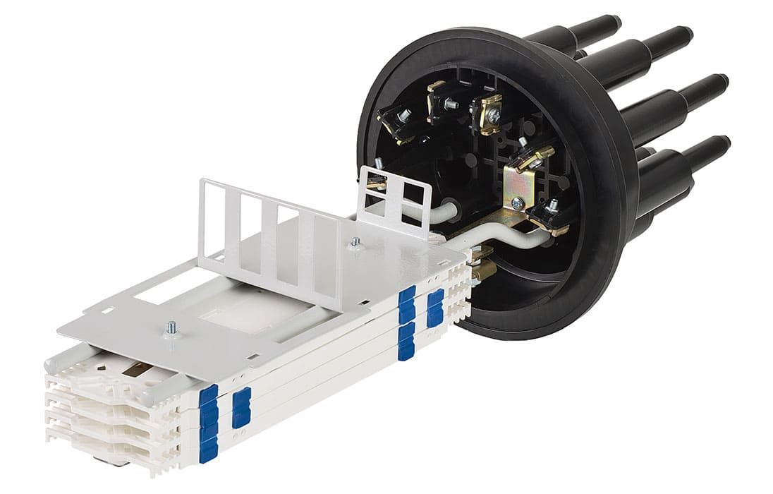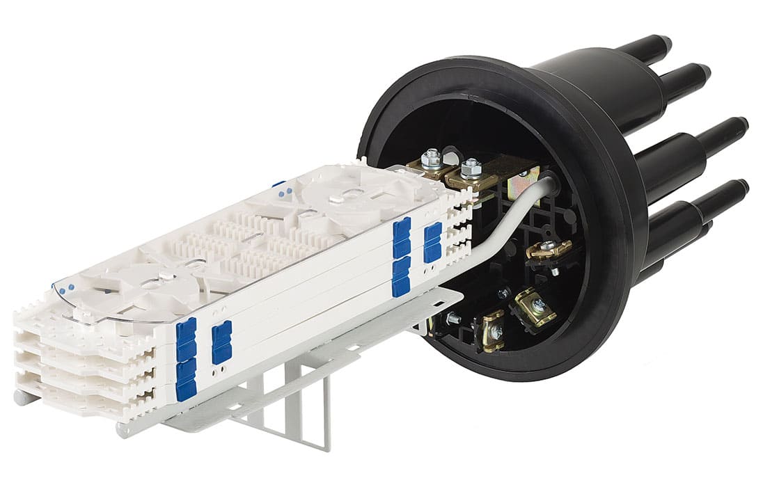 В муфте предусмотрен овальный ввод для транзитной петли оптических модулей без разрезания. Выкладка петли модулей осуществляется на лотке с противоположной стороны от кассет.