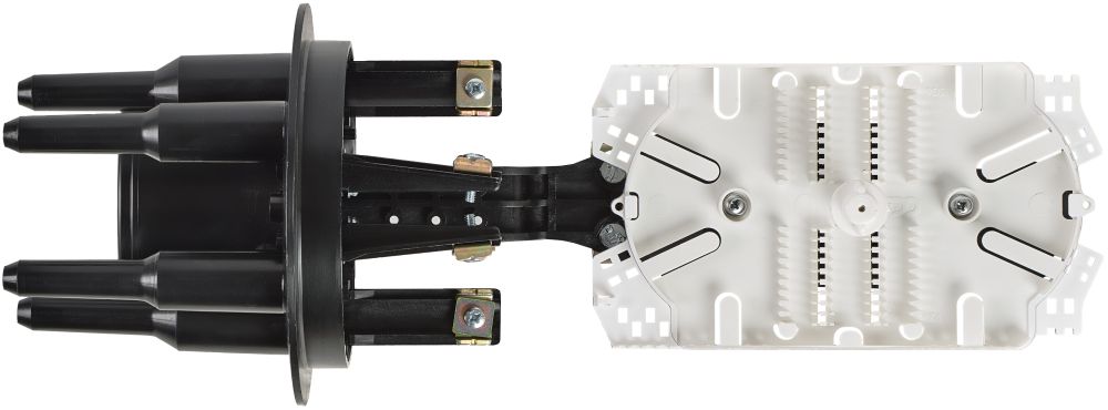 Предназначена для монтажа подвесных самонесущих ОК, оптических кабелей с вынесенным силовым элементом типа «8», а также городских кабелей любых конструкций, в том числе и с броней из стальной гофрированной ленты. В муфте предусмотрен овальный ввод для транзитной петли оптических модулей без разрезания. Выкладка петли модулей осуществляется на лотке с противоположной стороны от кассет, размер транзитной петли определяется при монтаже.
