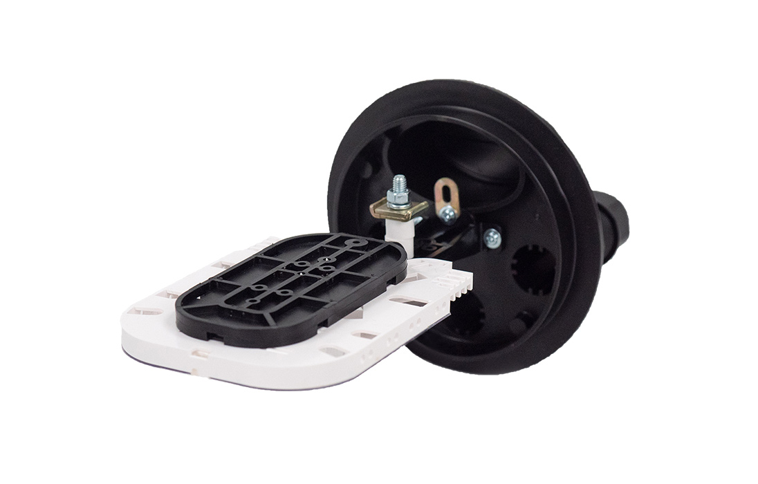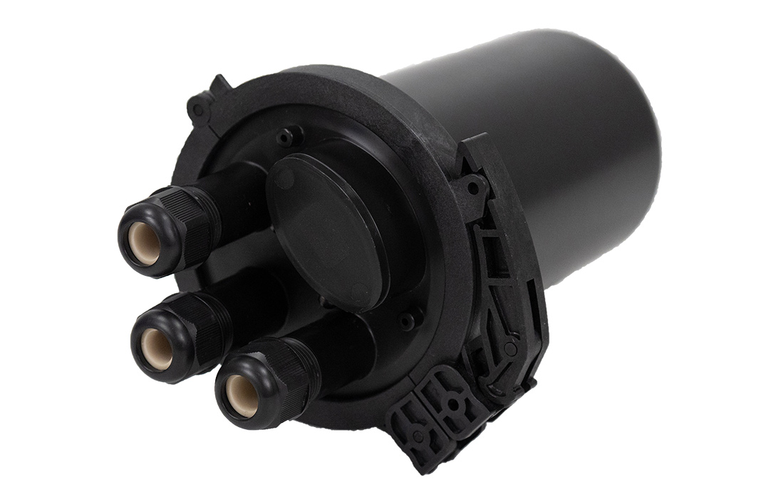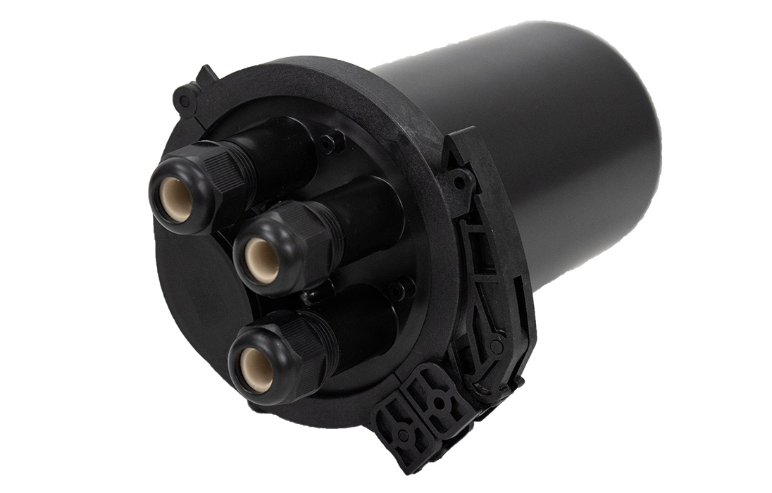 Ввод кабеля, крепление и герметизация осуществляется с помощью резьбовых фитингов, отлитых непосредственно на оголовнике муфты. Муфта имеет три круглых патрубка с фитингами и один овальный, герметизация вводимых в который кабелей осуществляется также механическим способом. Используя специальные комплекты для ввода в овальный патрубок можно ввести как два отдельных кабеля так и транзитный. Заглушка овального ввода выламывается при помощи молотка.