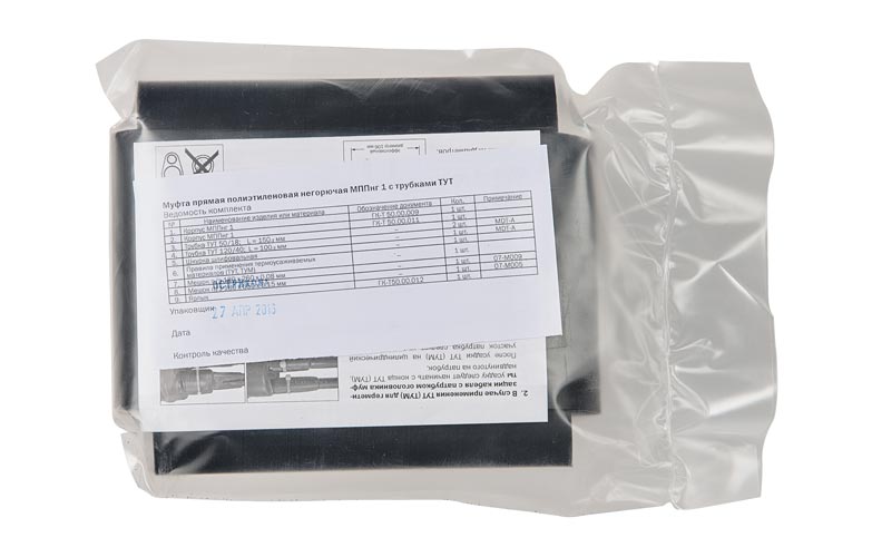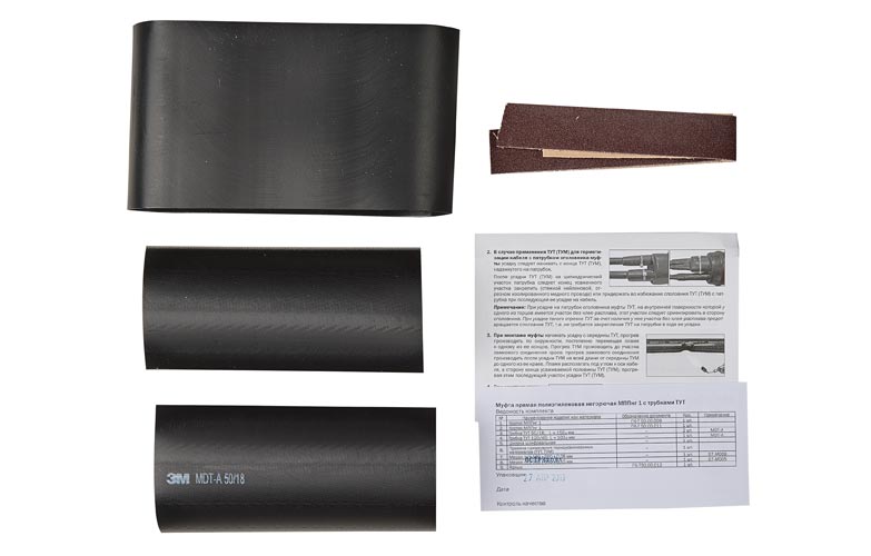 В комплект входят корпус муфты и отрезки трубок ТУТ не распространяющих горение, подобранные с учётом диаметров частей муфты и диаметров оболочек сращиваемых кабелей. Комплект позволяет выполнить только одну монтажную операцию – герметизацию муфты. Для выполнения остальных монтажных операций, таких как сращивание жил, восстановление экрана, восстановление поясной изоляции, следует дополнительно приобретать расходные материалы.