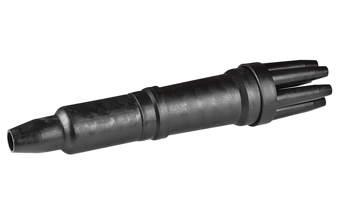 На оголовнике муфты размещены шесть патрубков. Три из них в состоянии поставки заглушены. Это позволяет использовать муфту в качестве станционной разветвительной муфты с вводом трёх, четырёх, пяти и шести кабелей ТСВ 100х2.