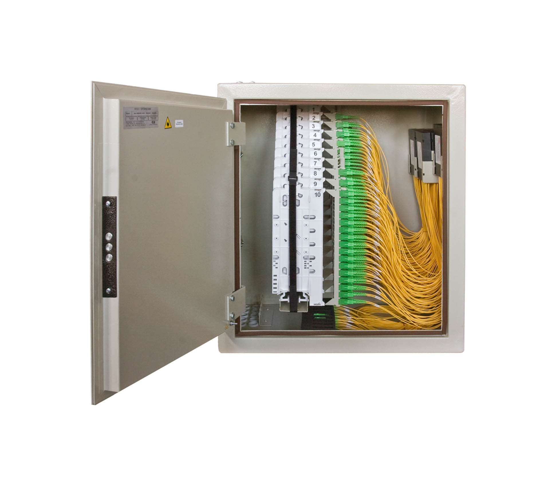 В шкафу предусмотрены несколько монтажных зон. В зоне ввода оптические кабели разделываются и фиксируются. Далее волокна в транспортных трубках поступают в зону монтажа на соответствующий кроссовый модуль. Планарные оптические разветвители устанавливаются в специальные контейнеры на правой боковой стенке шкафа.