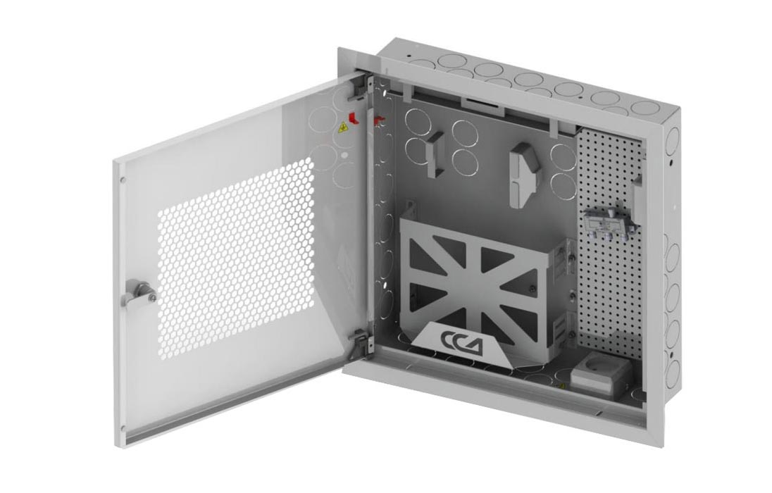 Оболочка шкафа состоит из корпуса и внешнего лючка с накладной рамкой и перфорированной дверцей с замком, изготовленные из стали толщиной 1,0 мм. Накладная рамка имеет возможность регулировки по глубине. Дверца имеет перфорацию для охлаждения установленного внутри активного оборудования и прохождения радиосигнала от WI-FI роутера. Корпус шкафа с четырёх сторон, а также на задней стенке имеет выламываемые кабельные вводы диаметром 36 мм. В комплекте со шкафом поставляются 6 резиновых заглушек кабельного ввода. На каждой боковой стенке а также на задней стенке корпуса выполнены отверстия диаметром 8,5 мм для крепления шкафа в стене на дюбелях. На задней стенке внутри шкафа имеется регулируемая по высоте и выдвижению полка для установки WI-FI роутера (роутер в комплект на входит), монтажная панель, органайзер кабельный, кронштейн для разветвителя на 4 параллельных порта RJ-45 (разветвитель в комплект не входит). За полкой WI-FI роутера на задней стенке имеется крепёж для установки RF-усилителя (RF-усилитель в комплект не входит). На боковой стенке и в дне корпуса установлены силовые розетки. На двери и корпусе расположены элементы контура заземления.