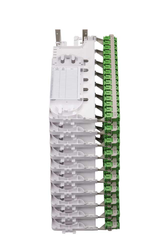 Конструктивной особенностью данного решения является монтаж и кросс-коммутация ОВ в откидных кроссовых модулях, объединенных в кроссовые блоки. Каждый модуль содержит кассету для укладки ОВ и панель с адаптерами (до 24 FC или 32 SC). В собранном состоянии модули размещаются в блоке вертикально, при этом адаптерные панели образуют кроссовое поле. При повороте модуля в горизонтальное положение обеспечивается удобный доступ к адаптерам и пигтейлам. Для монтажа модуль свободно снимается с блока за счет запаса длины транспортных трубок.