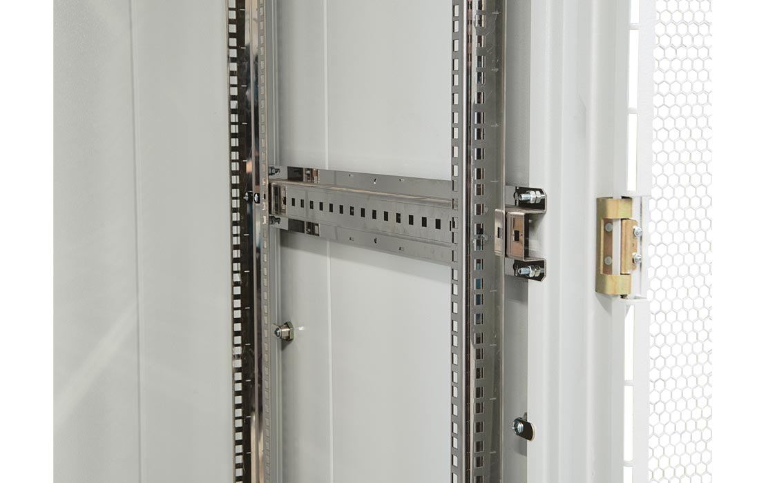 Вертикальные направляющие регулируются по глубине. Система заземления шкафа входит в стандартную комплектацию.