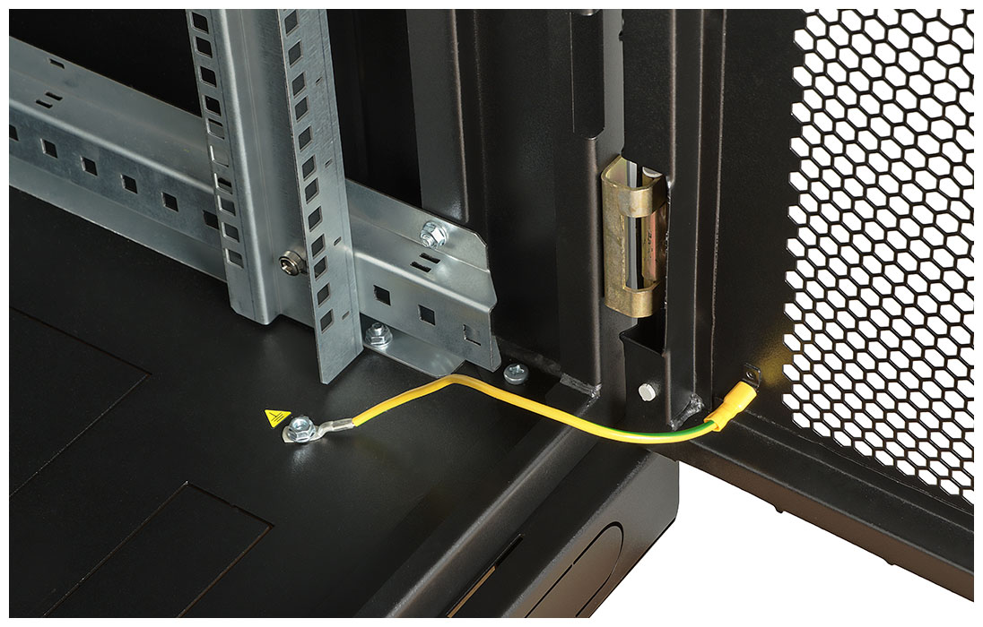 Вертикальные направляющие регулируются по глубине. Система заземления шкафа входит в стандартную комплектацию.