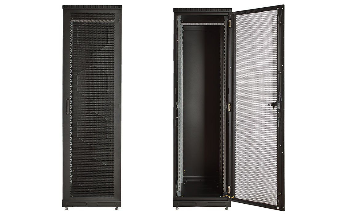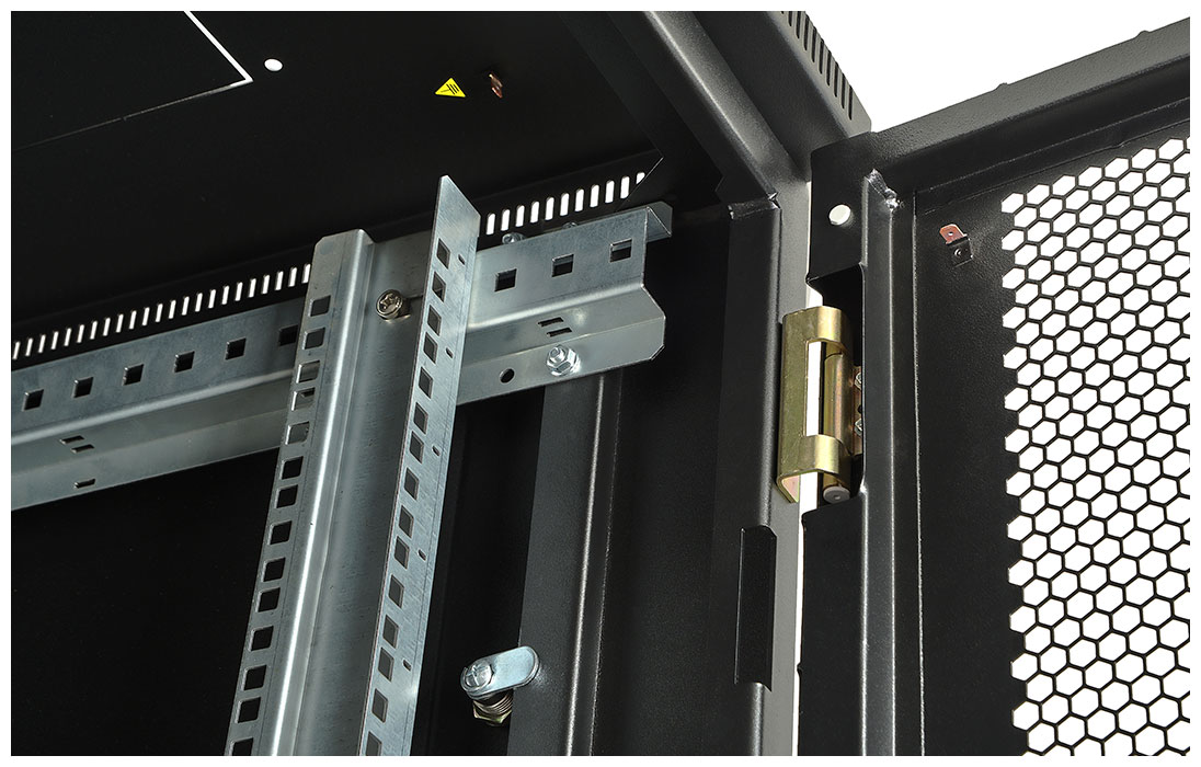 За счет элементов крепления каркас шкафа имеет повышенную жесткость. Распределенная вертикальная нагрузка до 600 кг. Стандартно шкаф комплектуется: передней дверью, боковыми и задней стенками с замками.