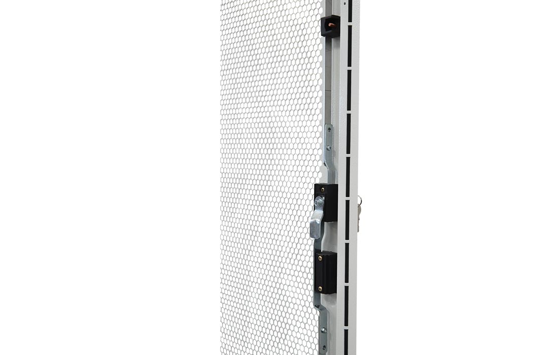 За счет элементов крепления каркас шкафа имеет повышенную жесткость. Распределенная вертикальная нагрузка до 600 кг. Стандартно шкаф комплектуется: передней дверью, боковыми и задней стенками с замками.