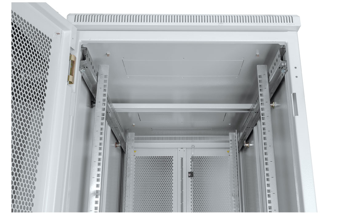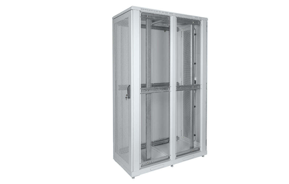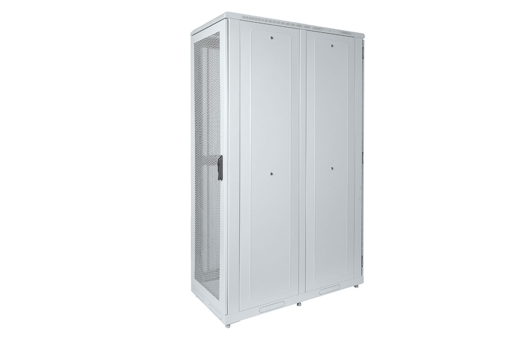 За счет элементов крепления каркас шкафа имеет повышенную жесткость. Распределенная вертикальная нагрузка до 1000 кг. Стандартно шкаф комплектуется: передней и задней дверями, боковыми стенками с замками.