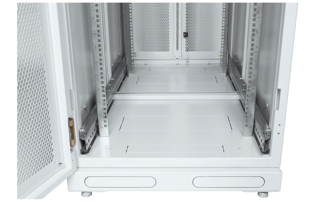 В основание шкафа предусмотрена установка шести винтовых опор (ножек), позволяющих компенсировать неровности пола, также возможна установка на ролики. Доступ для монтажа, коммутации и обслуживания оборудования возможен с четырех сторон.