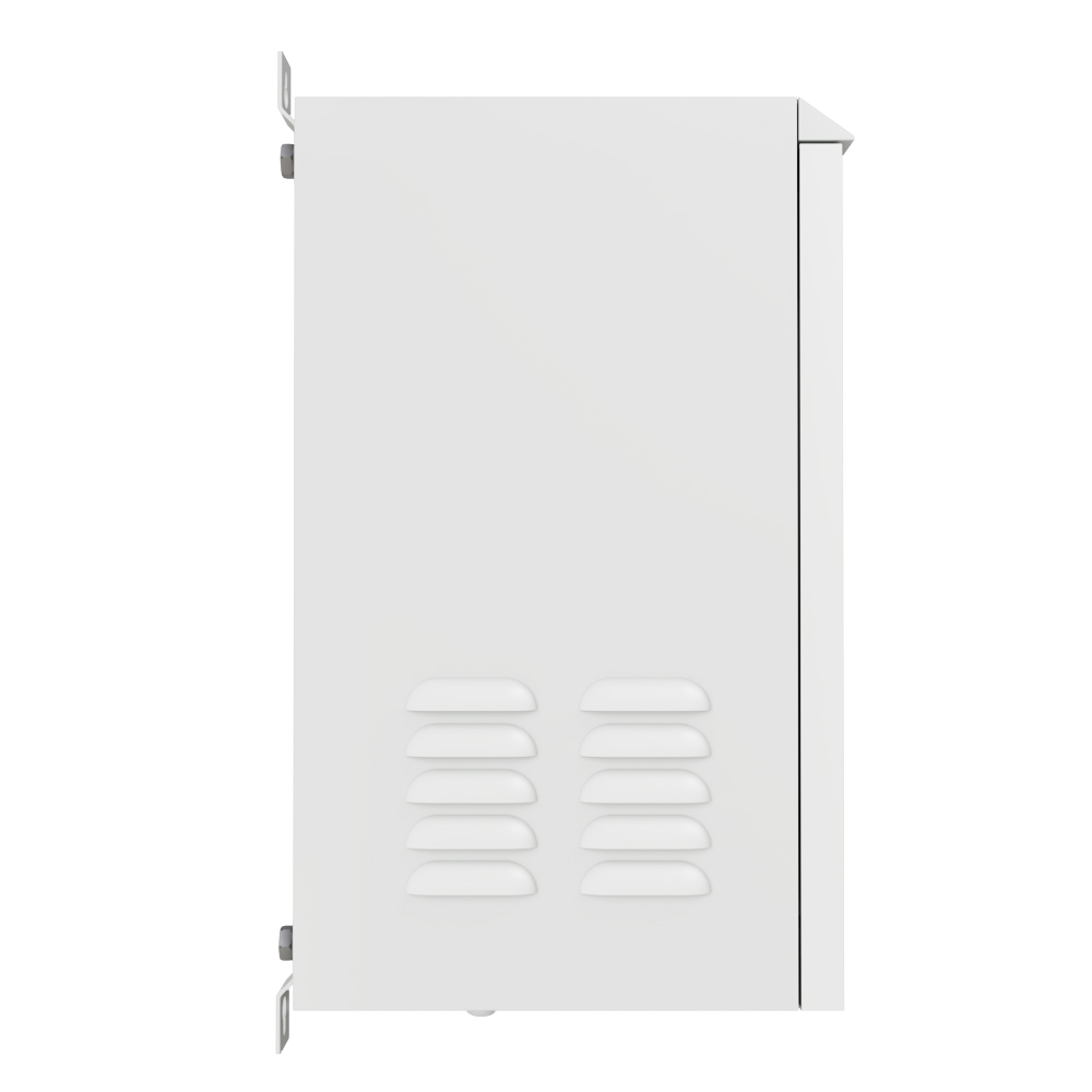 Корпус выполнен из листовой стали и имеет прочную сварную конструкцию, что говорит о высокой степени антивандальности всепогодного шкафа.