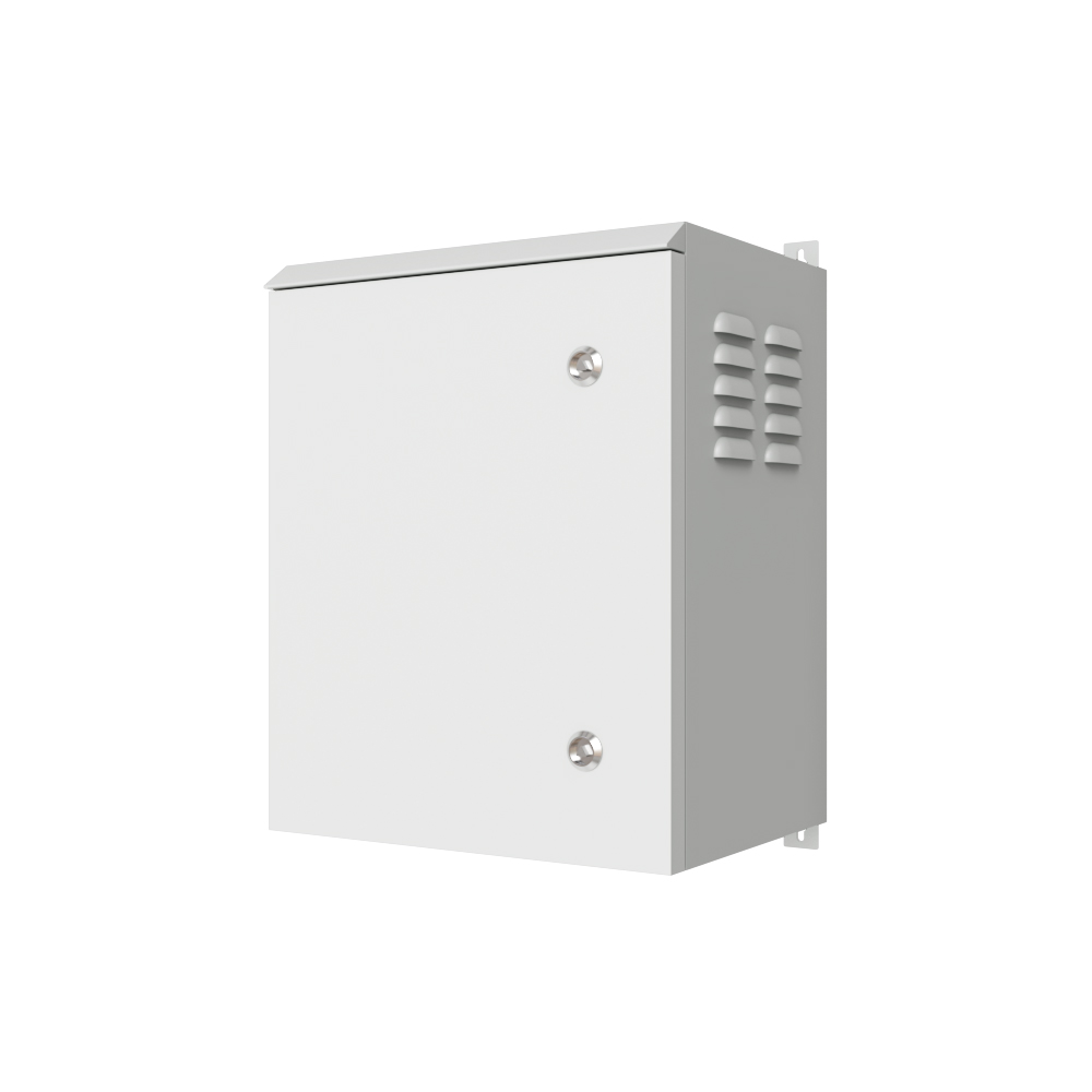 Корпус выполнен из листовой стали и имеет прочную сварную конструкцию, что говорит о высокой степени антивандальности всепогодного шкафа.