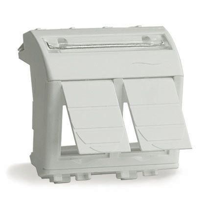 Адаптер на 2 информационных разъема (гнезда), 2 модуля. Назначение: установка неэкранированных разъемов RJ-11 и RJ-45. Характеристики: на 2 модульных гнезда; наклонная; с пылезащитными шторками (крышками); с окном (полем) для маркировки "рабочего места", размер окна ? 6х37 мм. Тип гнезда: Keystone. Перечень некоторых производителей гнезд такого типа: AMP, Hyperline, Premium Line Systems GmbH, BICC Brand-Reх, KRONE Link, AESP Signamaх, RiT Smar. Кол-во модулей: 2. Цвет: белый