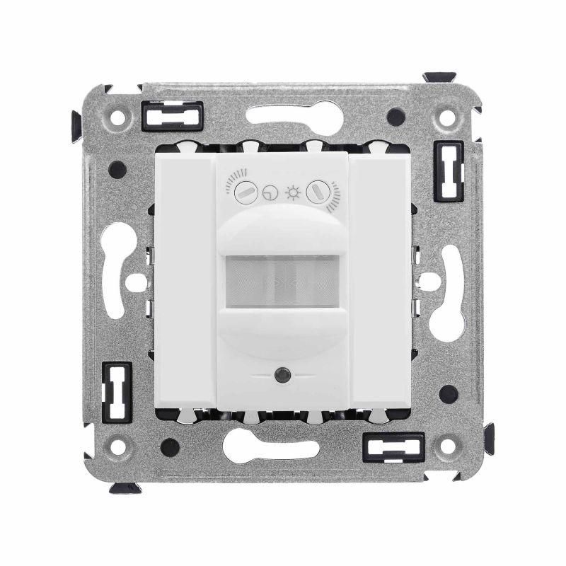 Датчик движения. Назначение: для монтажа в подрозеточные коробки глубиной не менее 45 мм (код 59301). Используется для автоматического включения/выключения света. Характеристики: диаметр отверстий для ввода кабелей – 3 мм; винтовые зажимы; шаблон для зачистки кабеля – 11 мм; расстояние обнаружения – от 2 до 12 м; угол охвата – 150°; время задержки отключения – от 10 с до 7 мин.; настройка светочувствительности датчика; настройка порога освещенности; фиксация в подрозеточные коробки глубиной не менее 45 мм при помощи каркаса с лапками (код 4400802) и саморезов. Цвет: "Ванильная дымка".