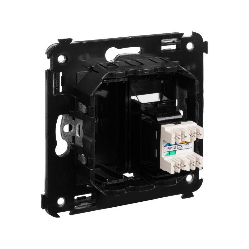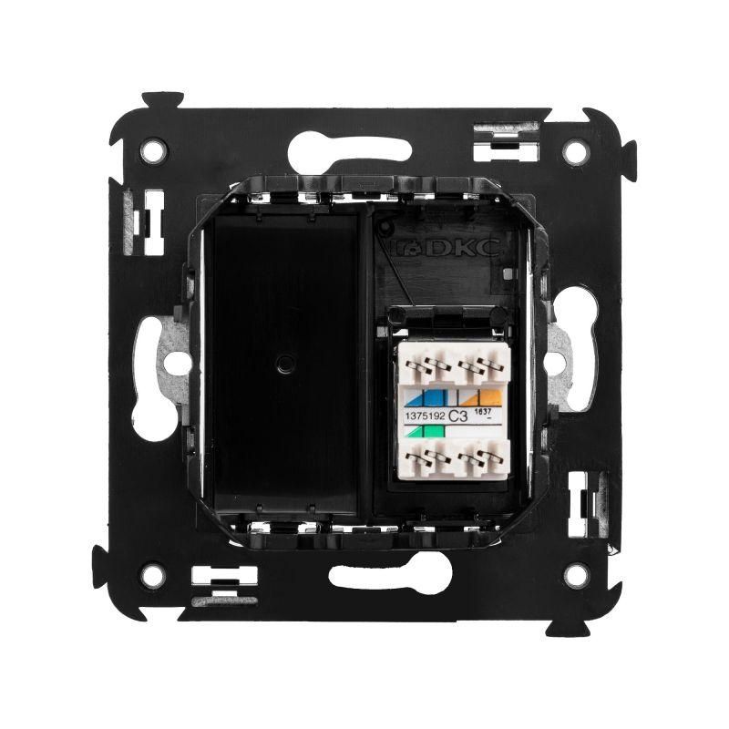 Телефонная розетка RJ-12 от ДКС устанавливается в стену (скрыто) и применяется для связи телефонных линий или же коммутации телефонных аппаратов с розеткой. Материал – металл, термопласт. Пластиковые части имеют нежный оттенок "Черный квадрат" – изысканный, таинственный, мистический черный, придающий особый шарм лаконичным формам рамок для ЭУИ "Avanti".