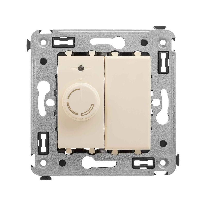 Диммеры предназначены для управления контуром освещения и регулировки интенсивности освещения помещения. Регулирование 60–800 Вт для ламп накаливания и галогенных ламп. Применяются для скрытой установки в стену, механизмы поставляются в комплекте с суппортом. Пластиковые детали электроустановочного изделия имеют оттенок "Ванильная дымка".